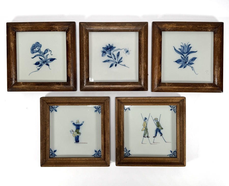Vijf ingelijste aardewerktegels van Koninklijke Tichelaar Makkum, handbeschilderd in blauw-wit en polychroom decor, uitgevoerd in houten lijstjes, ca. midden twintigste eeuw, Nederland. Vervaardigd in tinglazuurtechniek op aardewerk.