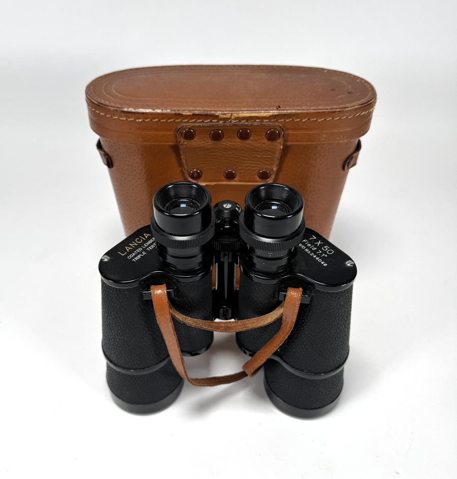 Verrekijker van het merk Lancia Japan, uitgevoerd in metaal en rubber, daterend uit het midden 20e eeuw, circa 1950–1970. Het optische instrument met Porro-prisma constructie heeft de specificaties $7\times50$ en Field $7.1^{\circ}$, voorzien van 'Coated Lens', in een bruin lederen etui.