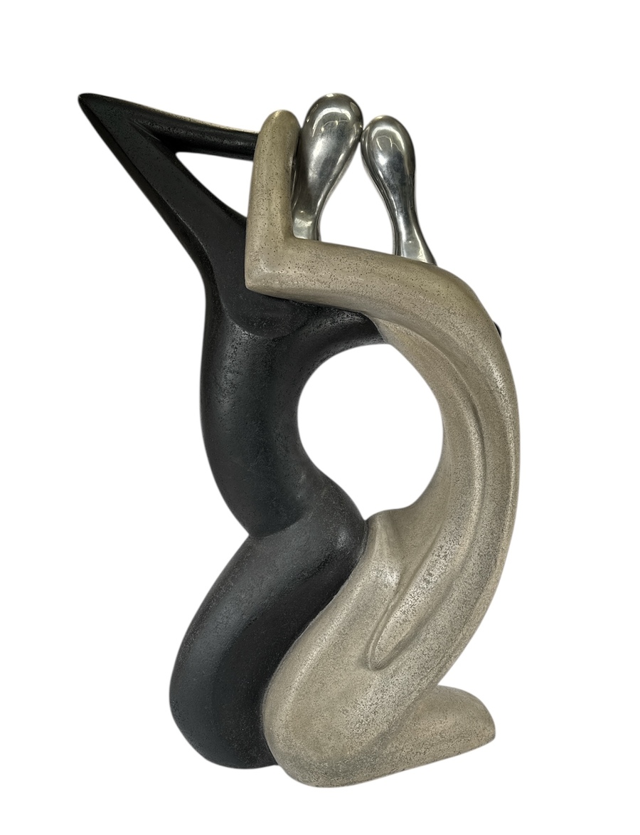 Groot formaat abstract modern beeld van een omhelzend paar, vervaardigd in composietmateriaal met een tweekleurige afwerking. Het beeld is gegoten in een minimalistische s-vorm en dateert uit de vroeg 21e eeuw. Kenmerkend is het contrast tussen het mat zwartgrijze en beige lichaam, met de hoogglans zilver-metallic afgewerkte hoofden.