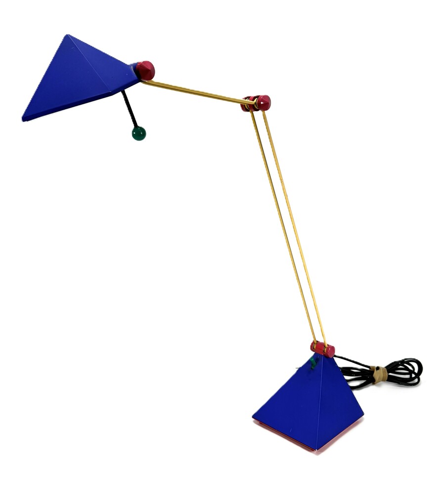 Deze kleurrijke postmoderne Memphis-stijl tafellamp is ontworpen door Lungean & Pellman voor Brilliant Leuchten, Duitsland, jaren 1980, uitgevoerd in gekleurd kunststof en gelakt metaal. Kenmerkend zijn de piramidevormige kap, gele metalen armatuur, rode verbindingsstukken en groen accentbolletje.