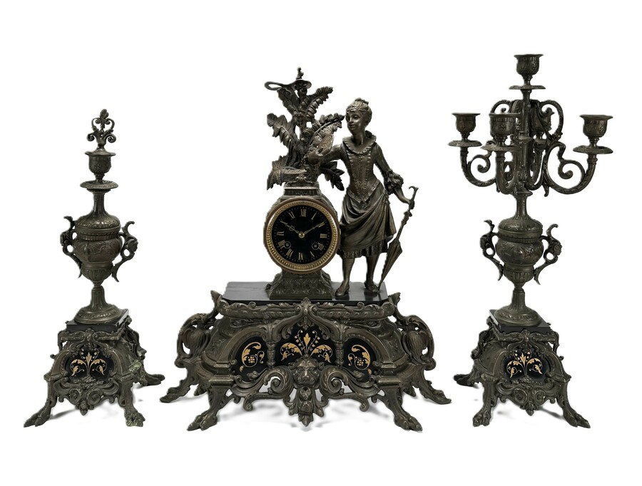 Klokstel bestaande uit een centrale mantelklok met figuur en twee witmetalen kandelaren, gepatineerd in neorococo stijl uit de tweede helft 19e eeuw, Frankrijk. Het uurwerk wordt geflankeerd door een vrouw met waaier en parasol, terwijl de kandelaren respectievelijk een enkele en een vijfarmige vorm tonen.