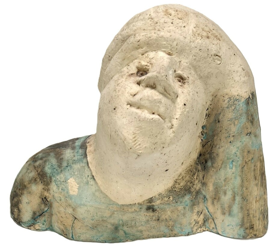 Beeld door Sjer Jacobs (1963) in expressionistische vormentaal, vervaardigd uit keramiek met geboetseerde modellering en gedeeltelijk turquoise gepatineerd oppervlak. Een hoofd met bovenop een hand, rustend op een compact torsofragment met blauwgroene accenten. Aan de binnenzijde gesigneerd Sjer 2001.