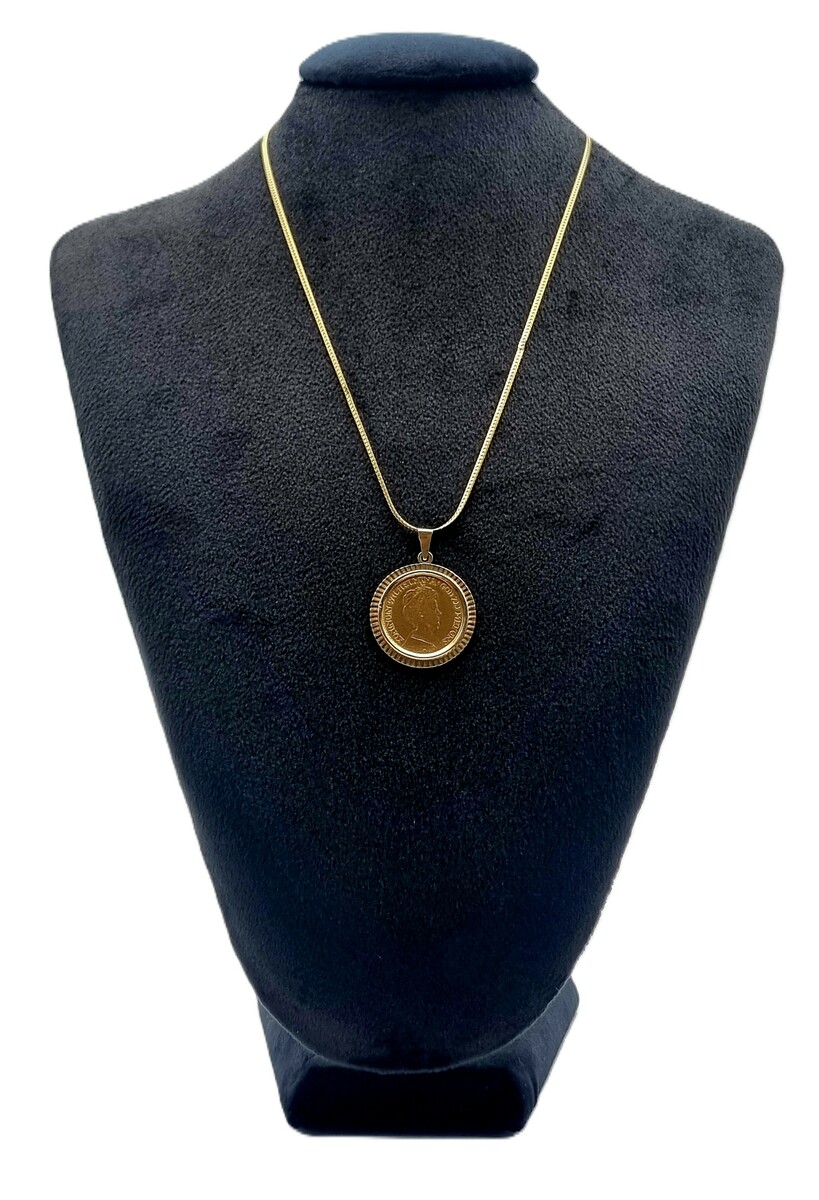 Gouden 14-karaats ketting met een hanger bevattend een gouden tientje uit 1917 in een gekartelde zetting. De ketting met slangenschakel is gemerkt met het 585-gehaltekeur op het oogje. Het sieraad toont het portret van Koningin Wilhelmina met hermelijnen mantel en de Nederlandse wapencompositie aan de achterzijde. Datering 2e helft 20e eeuw, Nederlandse herkomst.