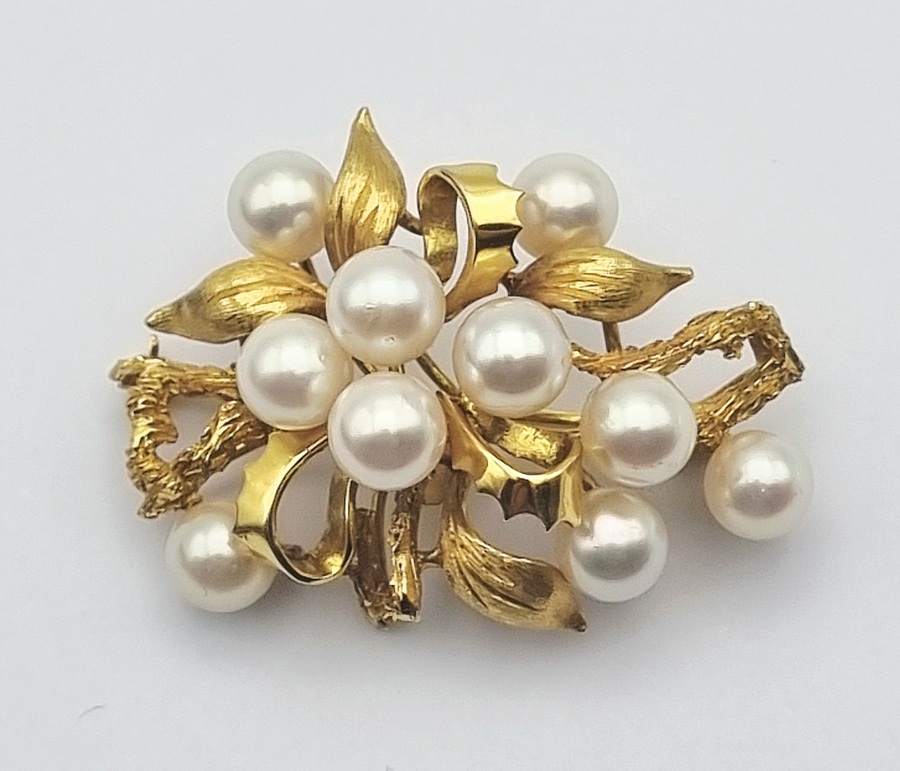 Gouden 14-karaats broche in de vorm van een rijk gedecoreerd bloemboeket, bezet met tien cultivé parels. Het sieraad toont een verfijnde afwisseling tussen gepolijste gouden linten en bladeren met een realistische, gematteerde textuur. Gemerkt 14 karaat goud, datering tweede helft 20e eeuw.