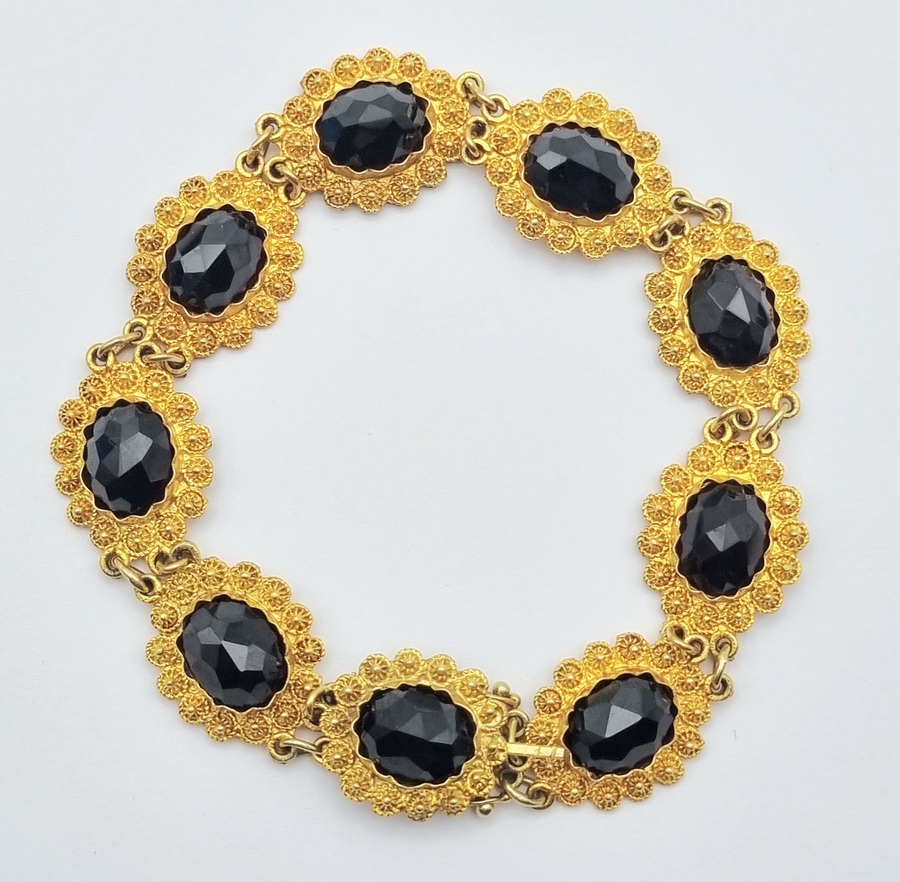 Gouden 14-karaats armband bezet met negen roosgeslepen granaten in een verfijnde zetting. Elke schakel is gedecoreerd met minutieus filigraanwerk en cannetille-details in bloemvorm. Het sieraad is voorzien van een bakslot met veiligheidssluiting. De armband toont een grote dichtheid in het fijnmazige gouddraadwerk tussen de centrale stenen. Datering 20e eeuw.