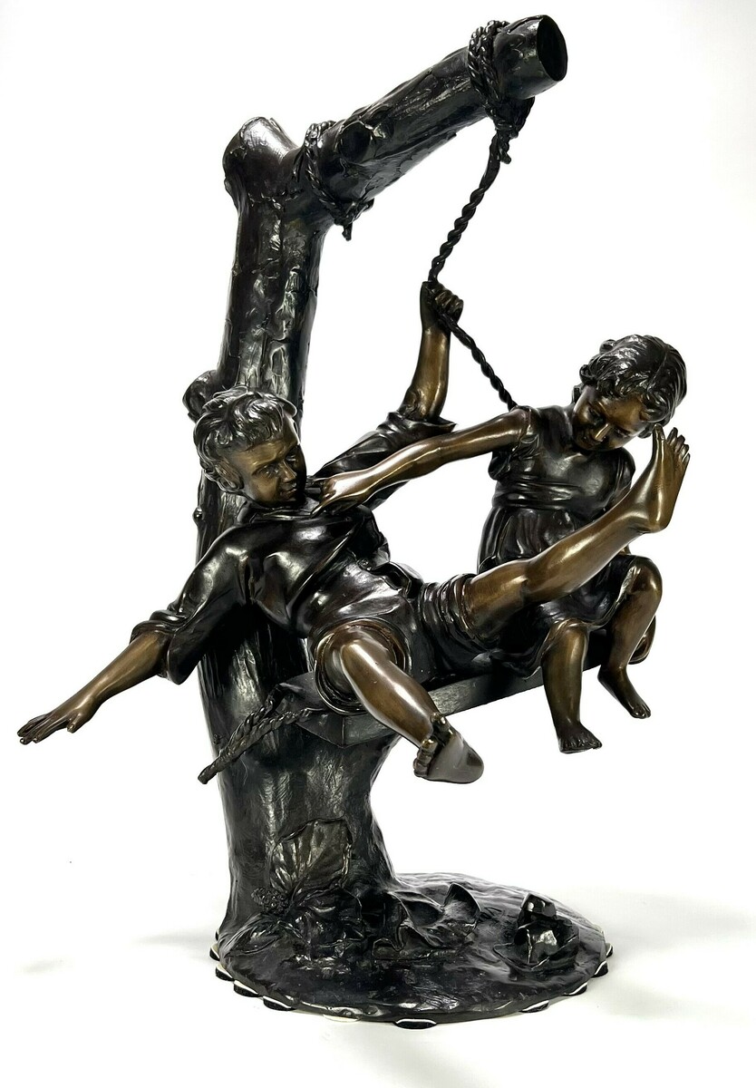 Beeld in de stijl van de Franse school, vervaardigd uit messing met een donkerbruine patina middels giettechniek. Het beeld toont een jongen en meisje op een schommel bevestigd aan een boomstam met getordeerd touwwerk. De figuratieve weergave is typerend voor de romantische beeldhouwkunst rond de eeuwwisseling. Het beeld dateert uit de eerste helft van de 20e eeuw en heeft een herkomst in Frankrijk.
