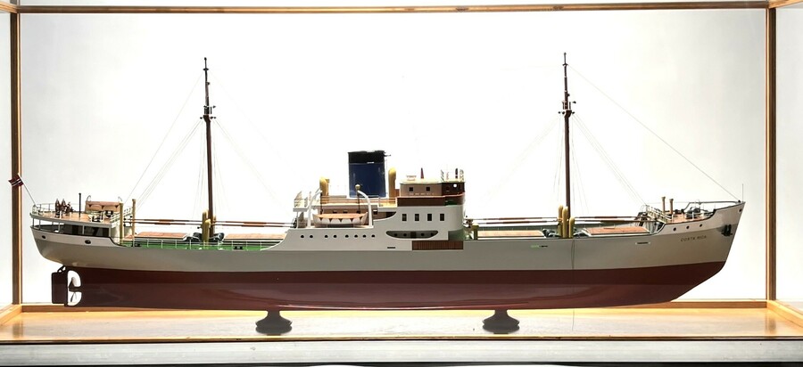 Scheepsmodel van de Noorse vrachtvaarder Costa Rica, uitgevoerd als gedetailleerd schaalmodel in een houten vitrinekast. Het scheepsmodel is geschilderd met een groen dek, voorzien van fijnmazig getuigde masten en messing beslag, met reddingsboten in davits en de Noorse vlag aan de achtersteven. Het scheepsmodel dateert uit de tweede helft 20e eeuw en heeft een Europese herkomst.