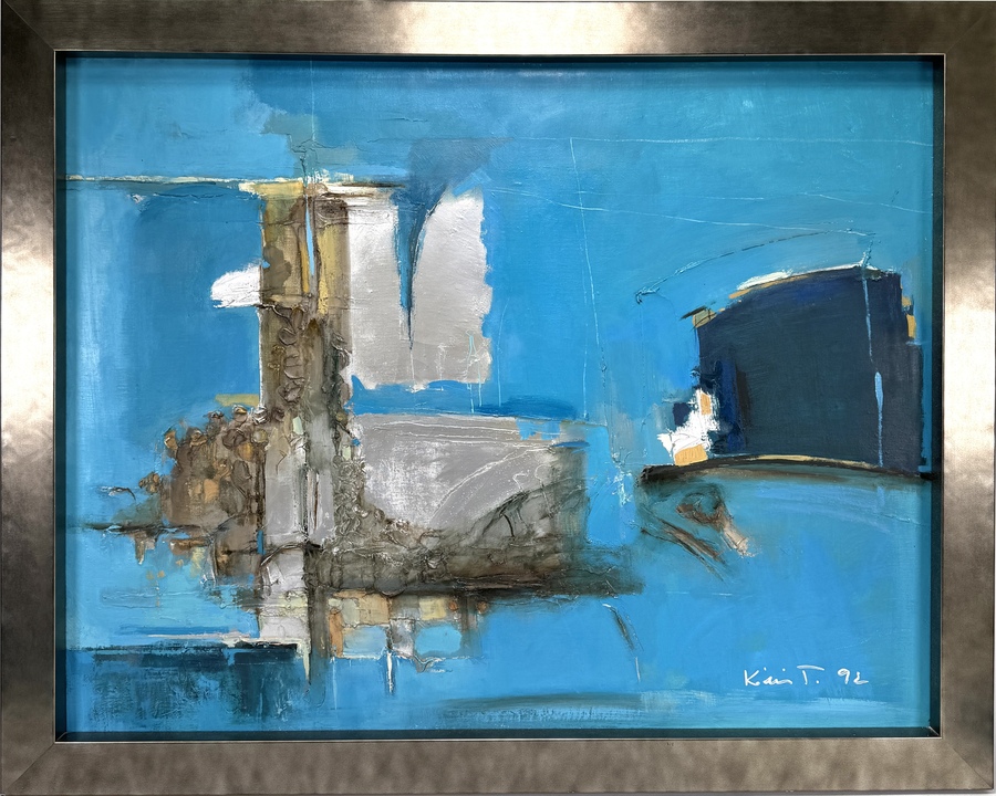 Schilderij door Tibor Kádár (1946–2021), uitgevoerd in olieverf op doek, in abstract-expressionistische stijl. Rechtsonder gesigneerd en gedateerd Kádár T. 92. Het werk toont een gelaagde compositie met blauw als dominante kleur, gecombineerd met textuur en contrasterende accenten. Gemonteerd in moderne lijst. Uitgevoerd in 1992, Roemenië.