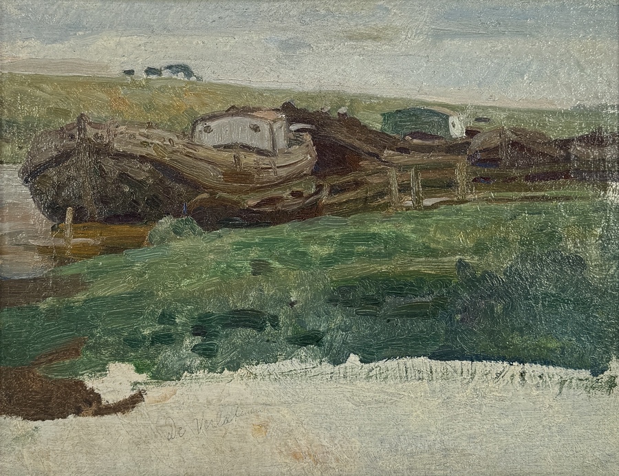 Schilderij getiteld "De Verlatenen" door Reinhart Dozy (Nijmegen, 28 september 1880 – Elp, 27 januari 1947) met een rivierlandschap en afgemeerde schepen. Olieverf op doek, geschilderd in impressionistische stijl, Nederland, eerste helft 20e eeuw. Het werk bevindt zich in een zilverkleurige lijst en draagt op de achterzijde een label van Museum Vledder met registratienummer “N.T.K. 284”.