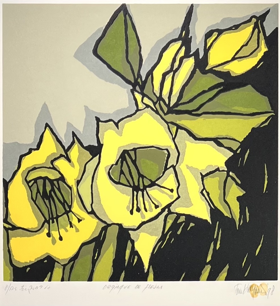Boardsnede door Fon Klement (1930–2000) toont een florale compositie getiteld "Orgiaque de Fleurs" in modernistische stijl. Deze hoogdruk kenmerkt zich door krachtige zwarte lijnen en een geel groen palet. Rechtsonder gesigneerd, gedateerd '98 en voorzien van twee vingerafdrukken. Linksonder genummerd 8/125 en midden onder getiteld.
