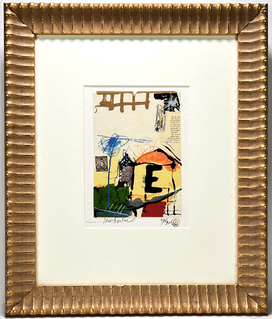 Zeefdruk met collage elementen door Theo Koster (1952) toont een abstracte compositie getiteld "Tanganyika 1c" in modernistische stijl, uitgevoerd in gemengde techniek op papier. Deze assemblage kenmerkt zich door het gebruik van poststempels, grafische krijtlijnen en een krachtig geel-zwart palet. Linksonder gesigneerd en rechtsonder genummerd 47/90. Deze zeefdruk dateert uit circa 1995 en heeft een Nederlandse herkomst; in een goudkleurige lijst.