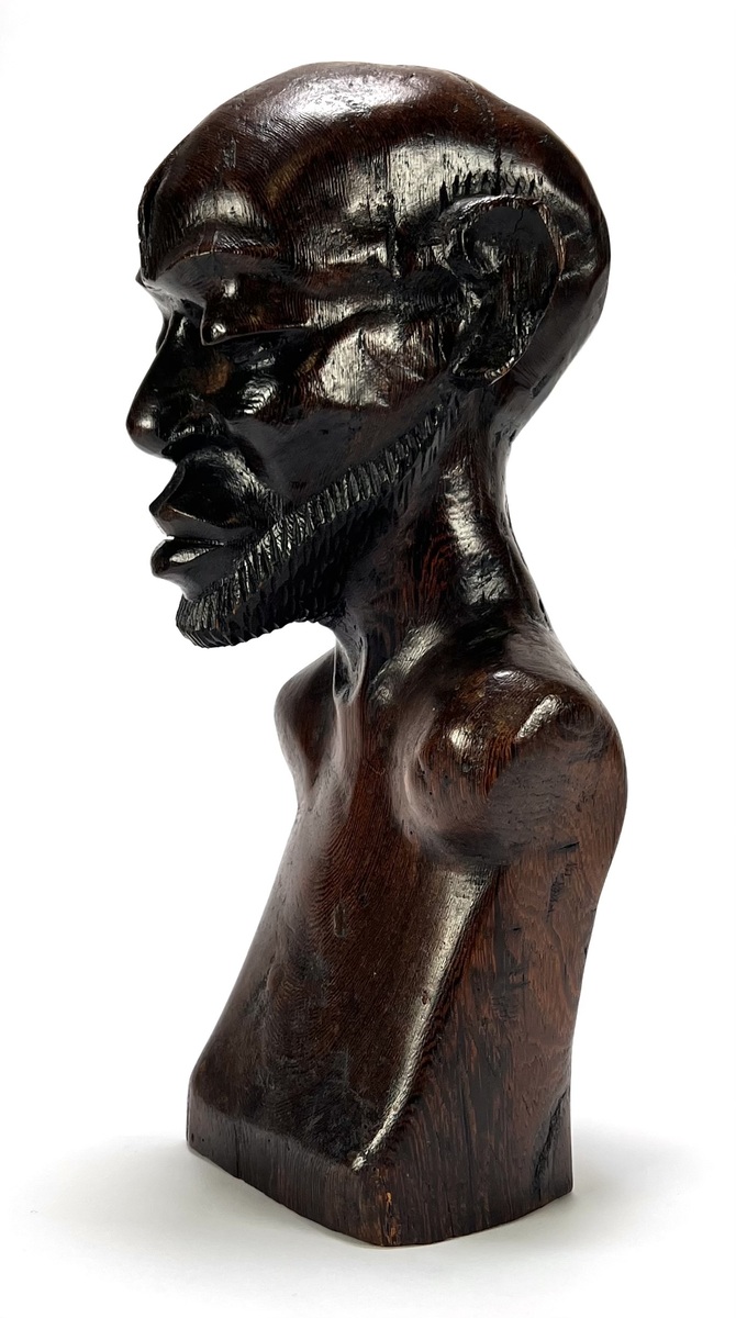 Makonde beeld uit Tanzania, late 20e eeuw, handgesneden uit donker gepolijst hardhout. Het mannelijke figuur toont naturalistische gelaatstrekken met een gestileerde baard en karakteristieke lineaire scarificatie op het hoge voorhoofd.