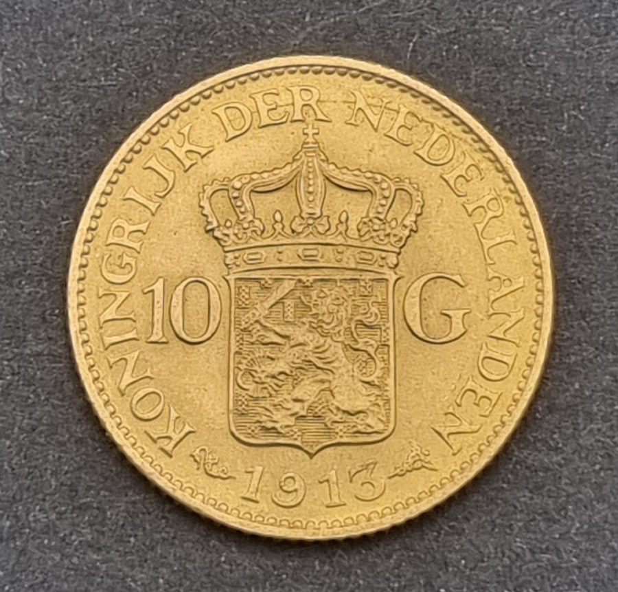 Gouden tientje Wilhelmina met hermelijnen mantel uit 1913, bevat 900/1000 goud en gemerkt met muntmeesterteken zeepaard. Rondom de munt is de tekst "KONINGIN WILHELMINA, GOD ZIJ MET ONS" geschreven en op de keerzijde is het gekroond Nederlands wapenschild afgebeeld. Het gouden tientje is ontworpen door J. C. Wienecke.