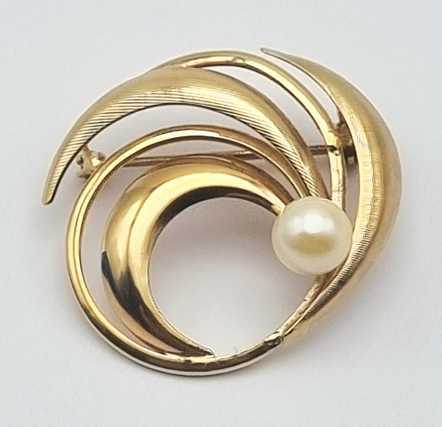 Gouden 14-karaats broche met cultivé parel, uitgevoerd in een opengewerkte compositie van overlappende, gebogen banen met afwisselend gladde en fijn gematteerde oppervlakken. De broche heeft een asymmetrische opbouw en vloeiende lijnvoering, datering midden van de 20ste eeuw