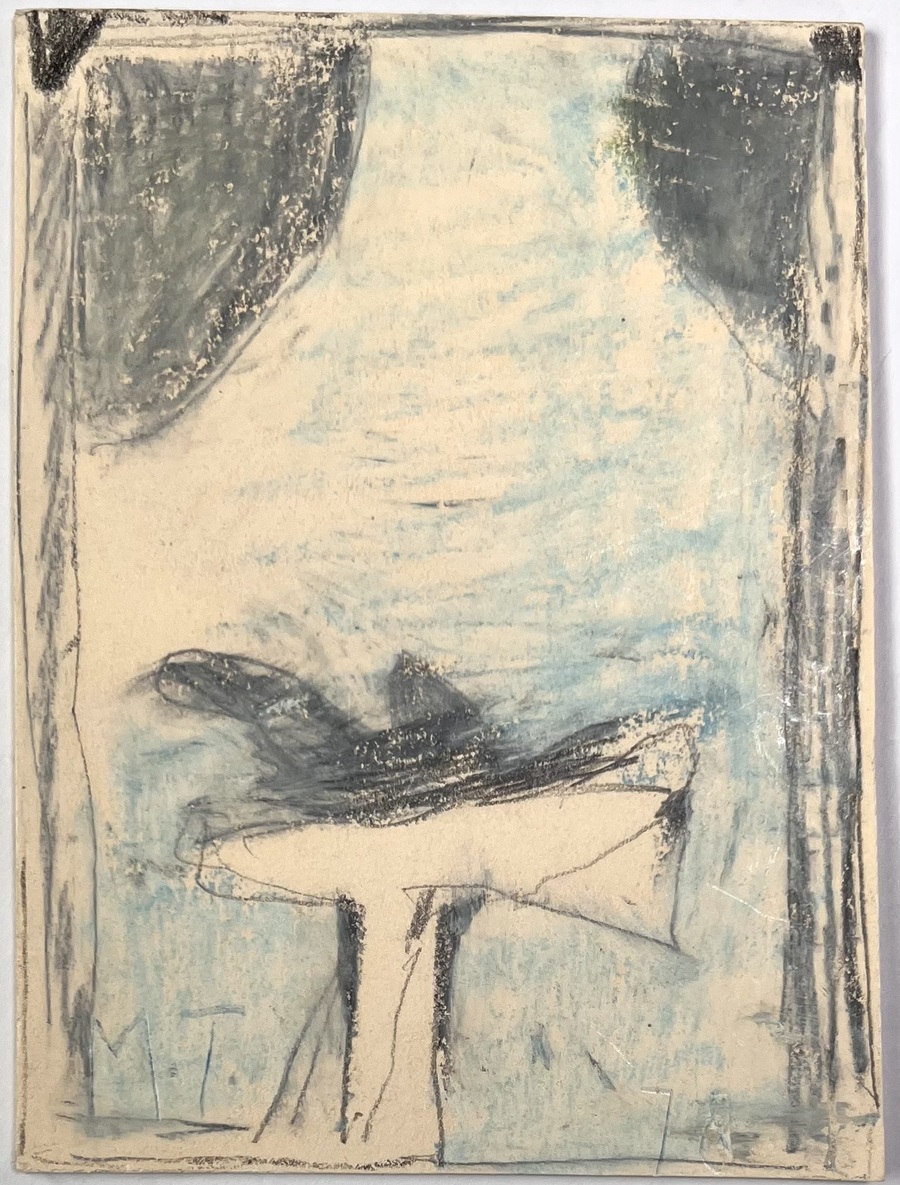 Tekening door Martin Tissing (1936–2018), potlood en waskrijt op papier, toont een abstract figuratieve voorstelling van een vogel in modernistische stijl. De tekening is getiteld "vogel in mijn venster", linksonder gemonogrammeerd M.T. en rechtsonder gedateerd 78. Verso getiteld en gedateerd 1978.
