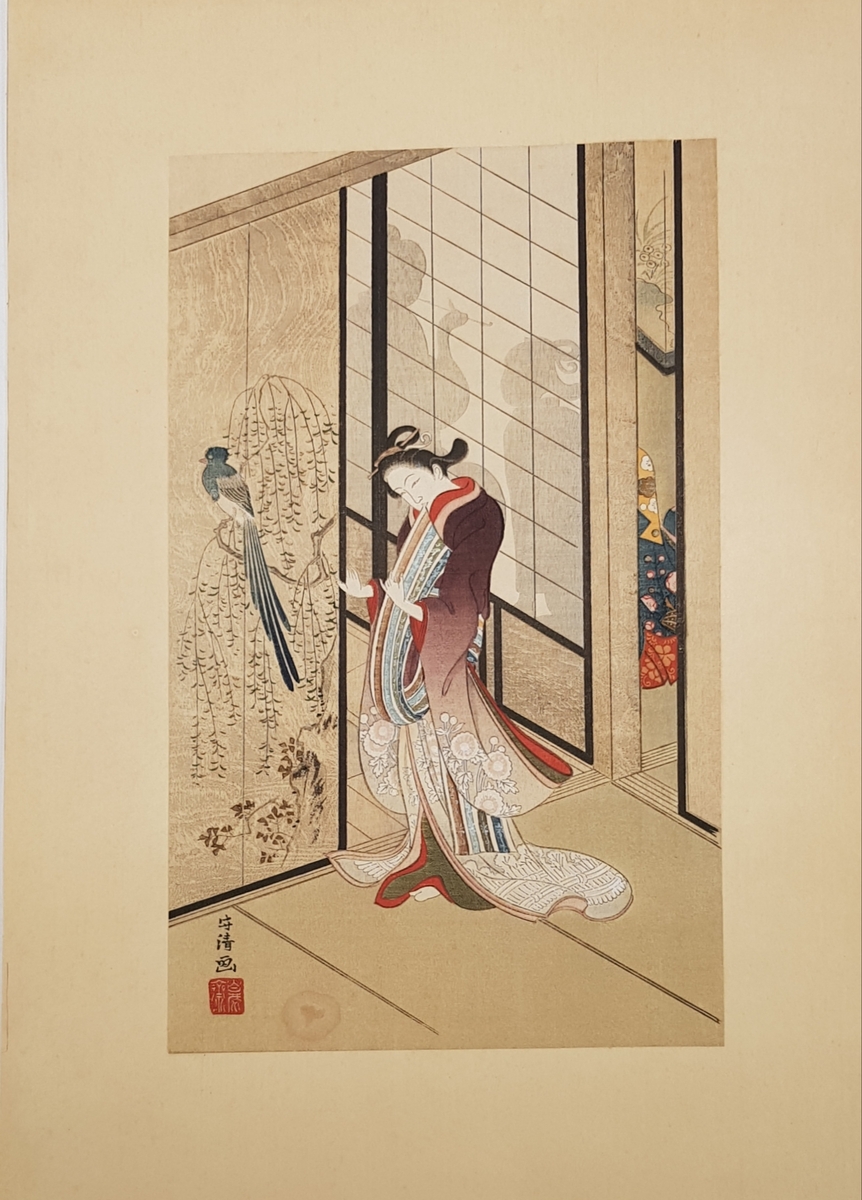 Japanse herdruk van een houtsnede van een bijin-ga in een interieur met schuifpanelen en een vogel. Herdruk uit de vroege Shōwa-periode, gedrukt op papier met een rode zegel in plaats van een uitgeversmerk. Jaren 1920–1940.