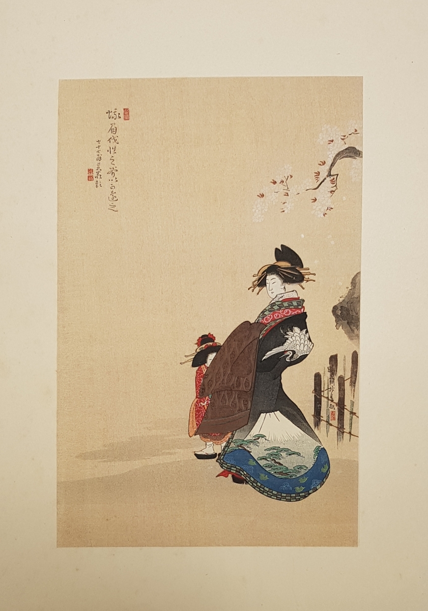 Japanse herdruk van een houtsnede, vrouw in kimono, uit de Shōwa-periode. Mogelijk uit een verzamelmap met “Meesterwerken van Ukiyo-e” of een vergelijkbare serie, indertijd populair bij kunstliefhebbers in Japan en het Westen. Datering midden 20e eeuw.