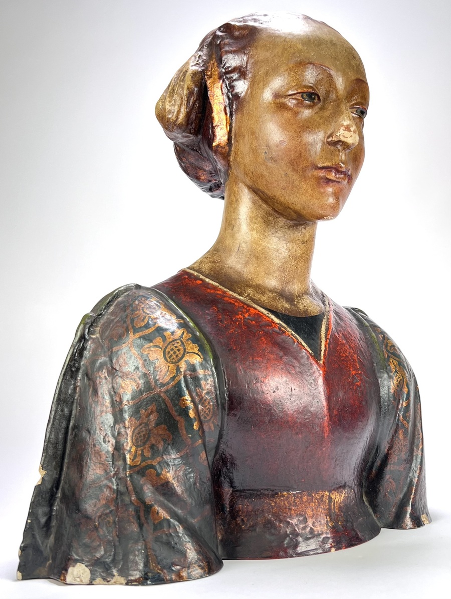 Buste uit de 19e eeuw, vervaardigd uit polychroom beschilderd gips. Het object toont een vrouwfiguur in neorenaissance stijl, gekenmerkt door een rijke decoratie op het gewaad en een verfijnde haarstijl met diadeem. Het academische model diende oorspronkelijk als studieobject voor tekenacademies. De buste heeft een Europese herkomst.