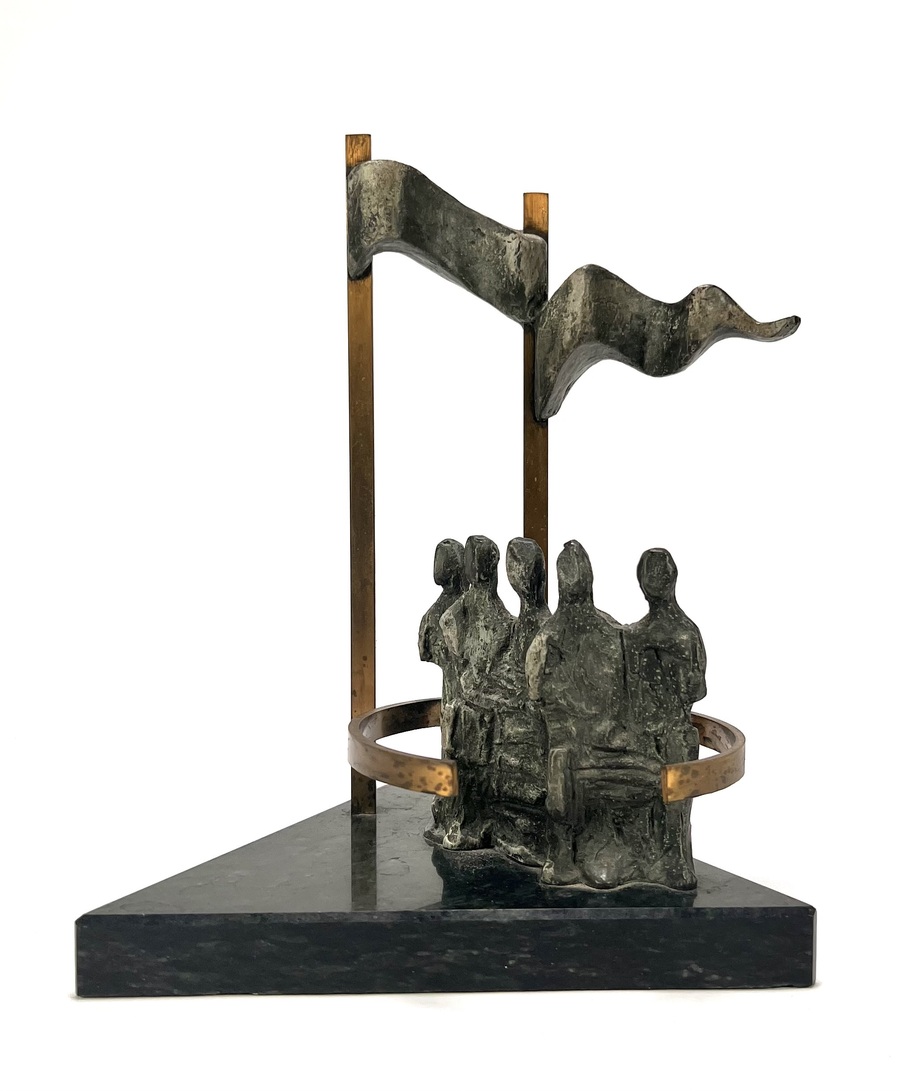 Beeld door Judith Braun (1955) in postmoderne beeldtaal, vervaardigd uit natuursteen met messing elementen op een driehoekige marmeren sokkel. De compositie toont een groep gestileerde figuren omsloten door een cirkelvormig messing element, met daarboven abstracte, zwevende vormen tussen verticale stijlen. Het object dateert uit de late 20e eeuw en heeft een Nederlandse herkomst.