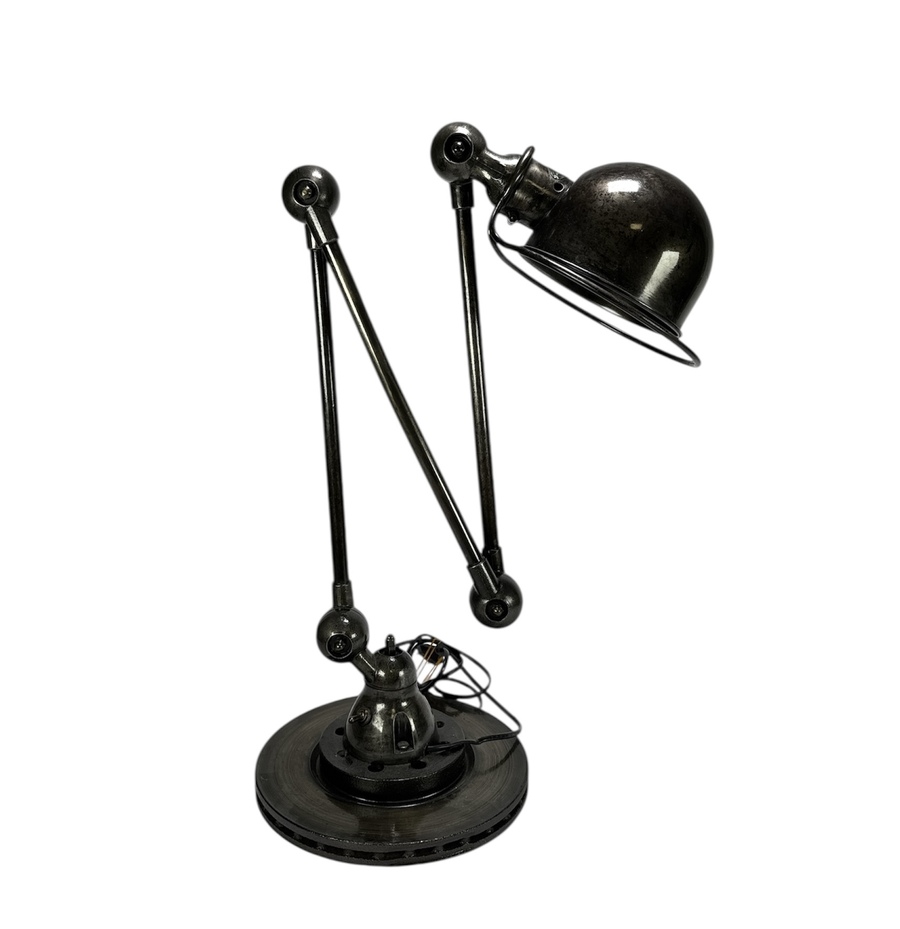Industriële lamp van Jean-Louis Domecq voor Jieldé uit de Mid-century moderne periode, vervaardigd uit antracietgrijs staal en aluminium. De Loft D9403 vloerlamp beschikt over drie verstelbare armen met draadloze scharnierpunten, de lamp is gemonteerd op een gerecyclede remschijf. Metalen plaatje met fabrieksmerk op de lampenkap. De lamp dateert uit het midden van 20e eeuw en heeft een Franse herkomst.