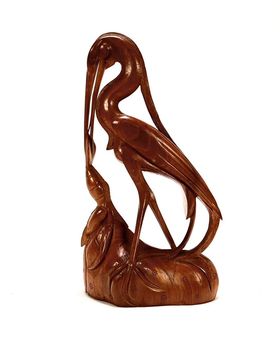 577. Houten beeld - reiger met vis, Indonesië, ca. 1950