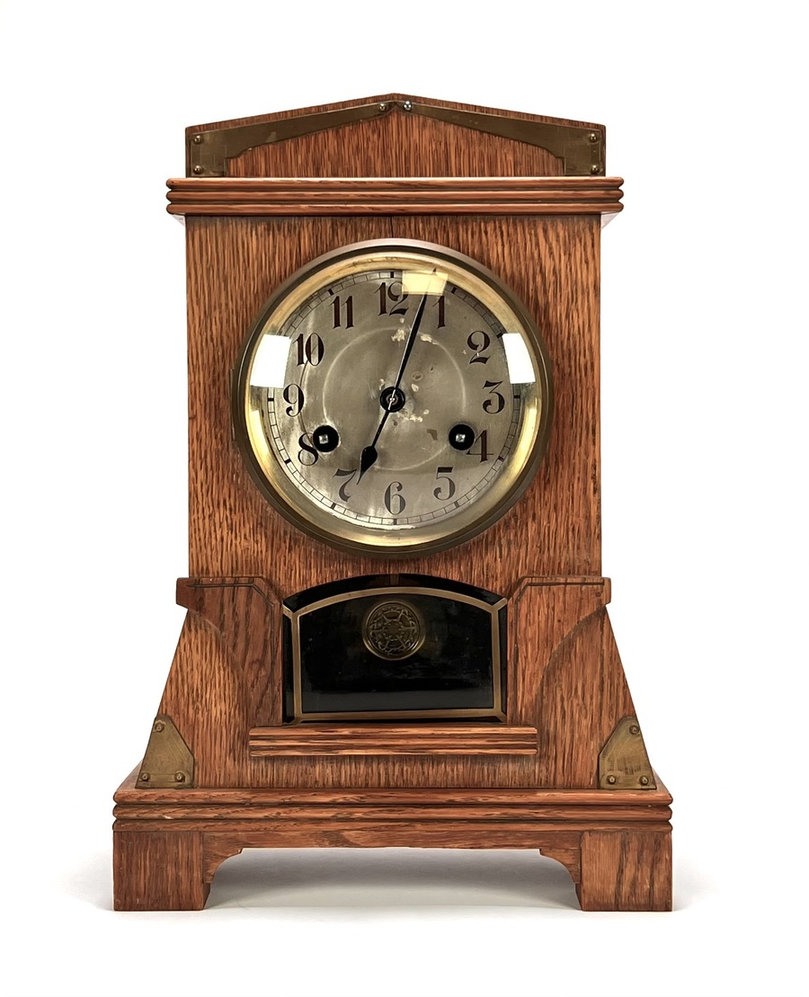 Tafelklok van Junghans (opgericht 1861) uit de Art Deco periode, vervaardigd uit eikenhout met messing beslag. De architecturale kast kenmerkt zich door een geometrische vormgeving met zadeldak en zijwaartse steunberen, de hoeken zijn verfraaid met goudkleurige metalen hoekstukken. De verzilverde wijzerplaat toont Arabische cijfers achter bol glas, gemerkt met het Junghans-sterlogo. De tafelklok dateert uit circa 1925 en heeft een Duitse herkomst.