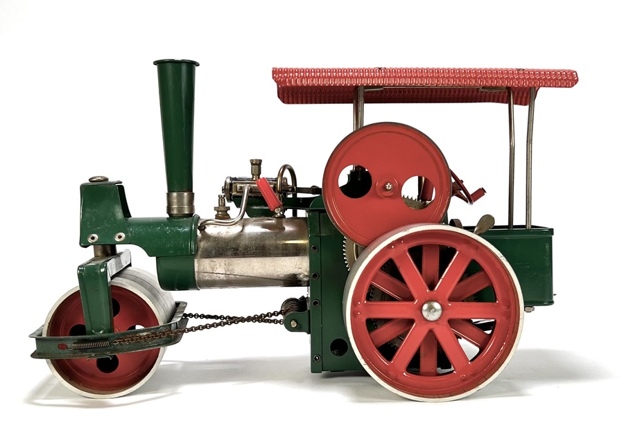 Stoommachine van Wilesco (Wilhelm Schröder GmbH & Co. KG) in industriële stijl, vervaardigd uit gelakt plaatstaal en messing met mechanische onderdelen. De replica van model D36 "Old Smokey" wals toont een groen chassis, rood gegolfd dak en zilverkleurige walsen. Voorzien van vliegwiel, schoorsteen en ketting gestuurde vooras. Gemerkt aan de achterzijde met "Made in Western-Germany". De stoommachine dateert uit de jaren zeventig en heeft een West-Duitse herkomst.