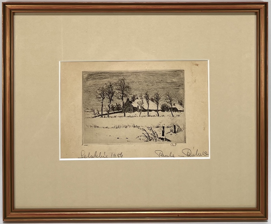 Ets door Riekele Prins (1905–1954) toont een winters dorpsgezicht met boerderij en rij kale bomen in realistische stijl, uitgevoerd als lijnets op papier. De lucht is opgebouwd uit dicht gestippelde arceringen, terwijl de besneeuwde erven en rieten daken in fijn lijnenspel zijn uitgewerkt. Gesigneerd rechtsonder en gedateerd 1954 linksonder in potlood. Deze ets heeft een Groningse herkomst.