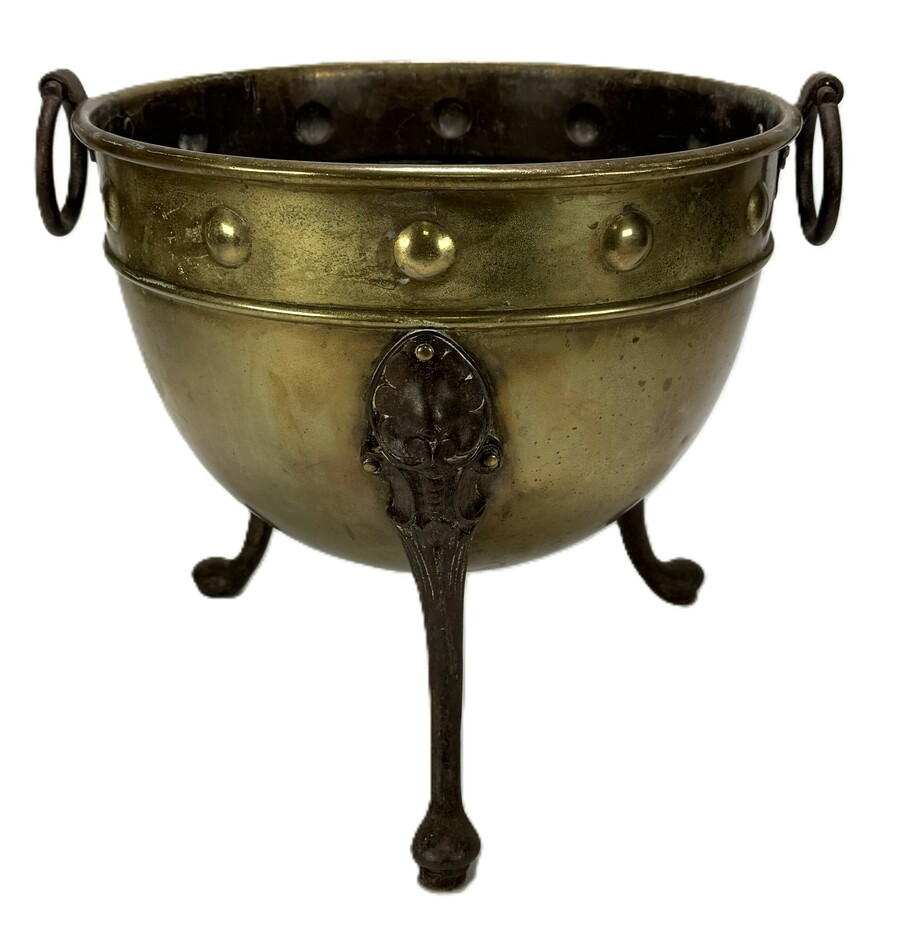 Jardinière van Henry Loveridge uit de late 19e eeuw, vervaardigd uit gedreven messing. De jardinière rust op drie gedetailleerde klauwpootjes en toont een decoratieve band van halfronde bolornamenten. Gemerkt op de bodem met het anker embleem van de Engelse fabrikant, daterend uit circa 1880 en een Britse herkomst.