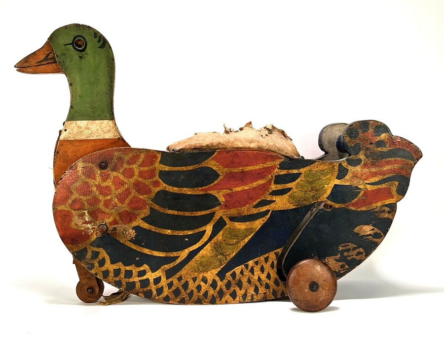 Rijspeelgoed uit de vroege 20e eeuw, vervaardigd uit handbeschilderd hout met een gestoffeerde zitting op een houten onderstel. Het rijspeelgoed toont een gestileerde wilde eend met een groene kop, witte halsband en meerkleurig verendek op de flanken. De constructie rust op vier houten wielen en bevat een blauw handvat aan de achterzijde.