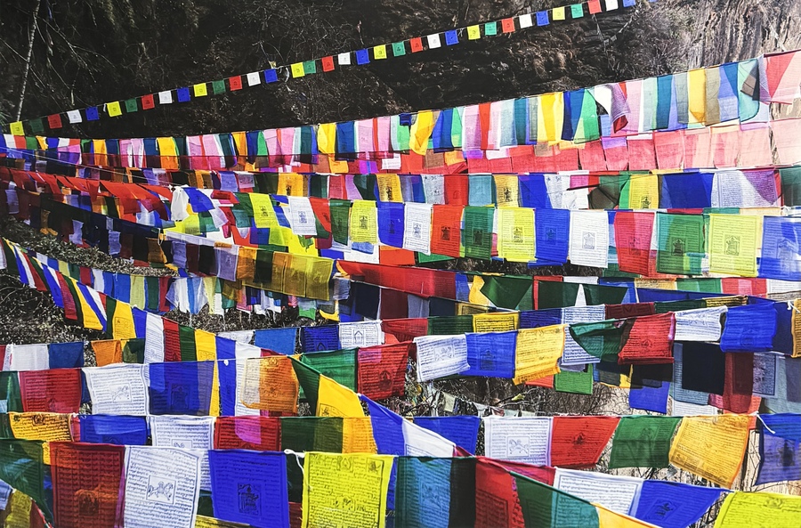 Kleurenfoto op papier, Viet Ha Tran (1981), 2022. Titel “Peace and Love”, fine art fotografie in levendige kleuren met Tibetaanse gebedsvlaggen, oplagenummer 1/20. Inclusief gesigneerd en gestempeld certificaat van echtheid en notitie van de kunstenaar, gepresenteerd in zwarte metalen lijst met passe-partout.