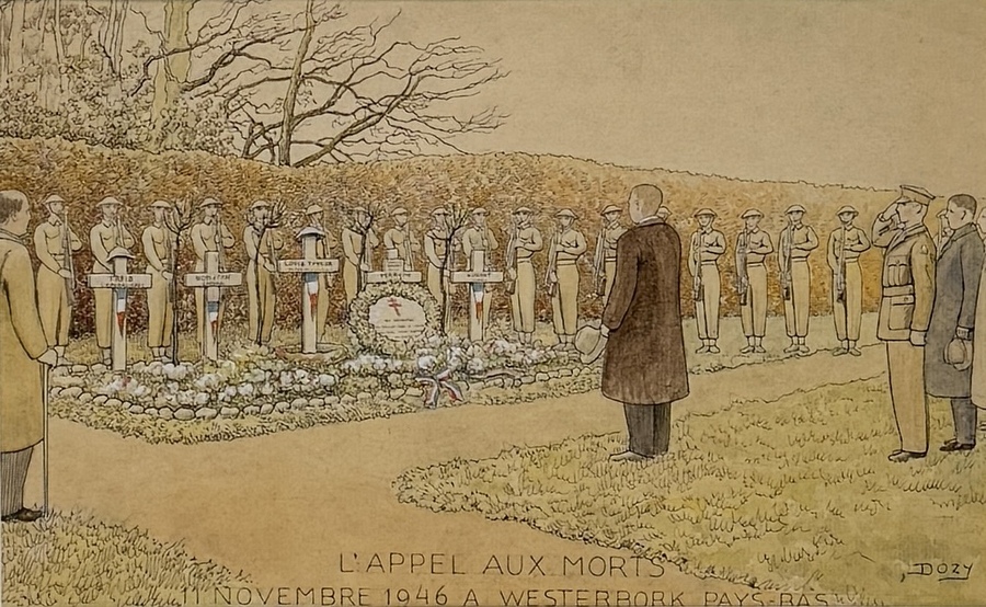 Ingekleurde pentekening op papier door Reinhart Dozy (1880-1947), getiteld “L’ Appel aux Morts 11 novembre 1946 à Westerbork (Pays-Bas)”. Het werk toont een stille herdenkingsceremonie bij Kamp Westerbork op 11 november 1946 waarin soldaten in linie staan bij houten kruisen en een centrale spreker. Rechtsonder gesigneerd DOZY.