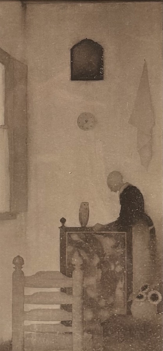 Heliogravure door Jan Mankes (1889–1920) toont een interieur met een staande vrouw in symbolistische stijl, uitgevoerd in heliogravure op papier. De verstilde compositie bevat karakteristieke elementen zoals een kerkuil, zonnebloemen en een wandklok in een gedempt palet. De heliogravure uit 1923 is naar een schilderij uit 1912 getiteld "Moeder in de kamer met uiltje". Het werk heeft een Nederlandse herkomst en is geplaatst in een zwarte lijst.