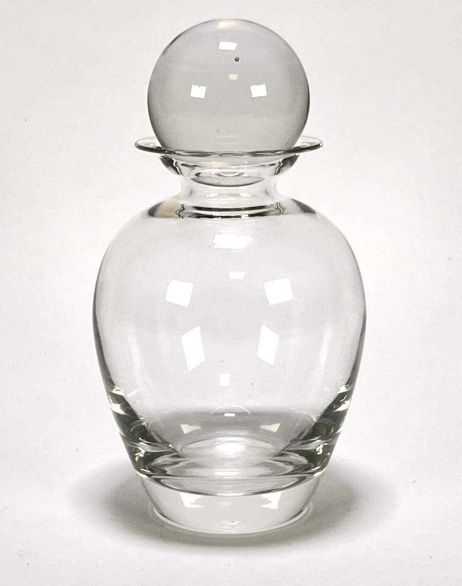 Art Deco likeurkaraf, model Rondo, naar ontwerp van Andries Dirk Copier (1901-1991) en uitgevoerd door Glasfabriek Leerdam 1935. Vervaardigd uit helderglas met bolvormige corpus en de bijbehorende massieve kristallen kogelstop. De onderzijde toont een geëtst monogram van de ontwerper.