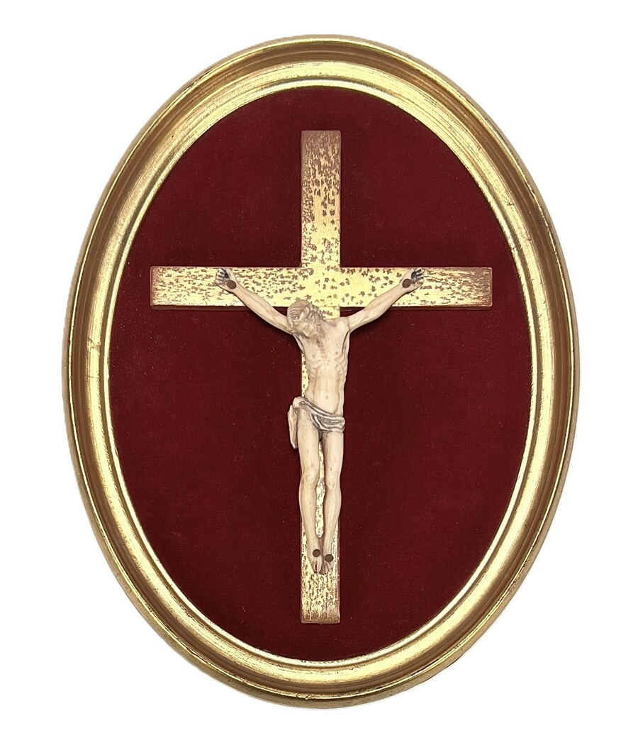 Sculptuur van Corpus Christi in barokke stijl, vervaardigd uit gesneden ivoor met verfijnde anatomische details, gemonteerd op een goudkleurig houten kruis tegen een achtergrond van dieprood fluweel, in een ovale goudkleurige lijst. De achterzijde toont een galerie etiket uit Roubaix. Het object dateert uit de 19e eeuw en heeft een Franse herkomst. Inclusief vereiste CITES-verklaring voor kopers binnen de EU.