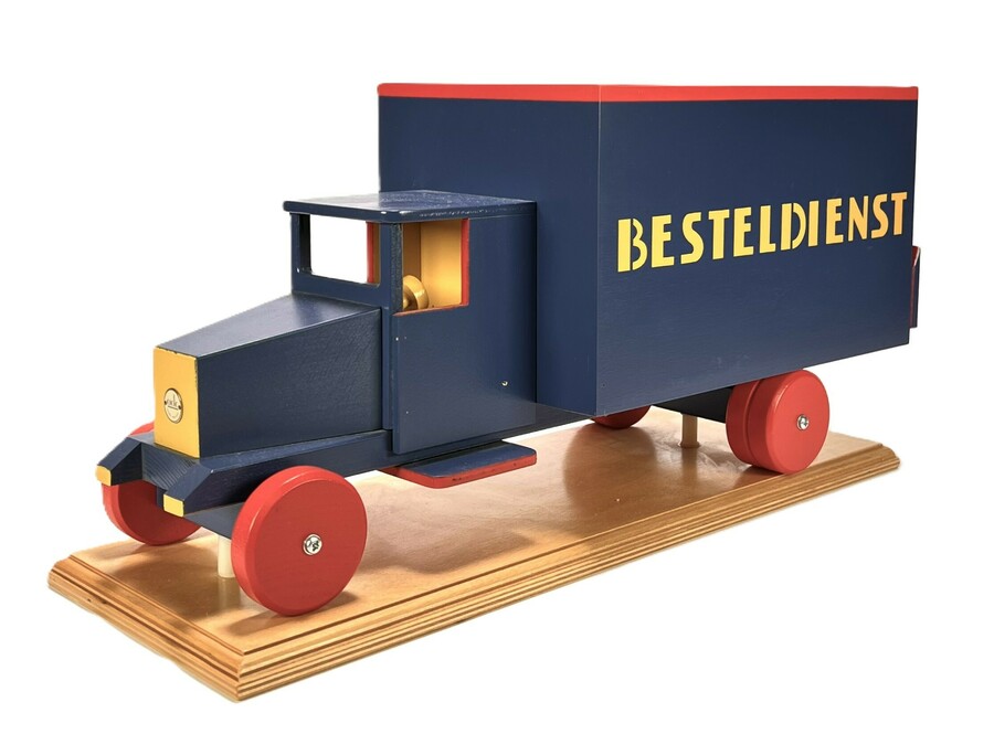 Bestelwagen van ADO (Arbeid door Onvolwaardigen) in de stijl van De Stijl, vervaardigd uit handbeschilderd hout. De bestelwagen heeft oplagenummer 195/250 en betreft een gelimiteerde replica van een origineel ontwerp uit de jaren dertig. Uitgevoerd in de karakteristieke primaire kleuren blauw, rood en geel met het opschrift Besteldienst. Voorzien van origineel certificaat en verpakking, vervaardigd in Zeist.