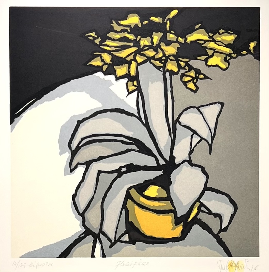 Boardsnede door Fon Klement (1930–2000) toont een bloemenstilleven getiteld 'Florifere' in modernistische stijl op papier. De compositie bevat een gele pot met gestileerde bladeren, gekenmerkt door krachtige zwarte contouren en een sober kleurgebruik van grijs en wit. Linksonder genummerd 14/125, eigen druk en rechtsonder gesigneerd voorzien van twee vingerafdrukken en gedateerd '96. Deze boardsnede dateert uit de late twintigste eeuw en heeft een Nederlandse herkomst.