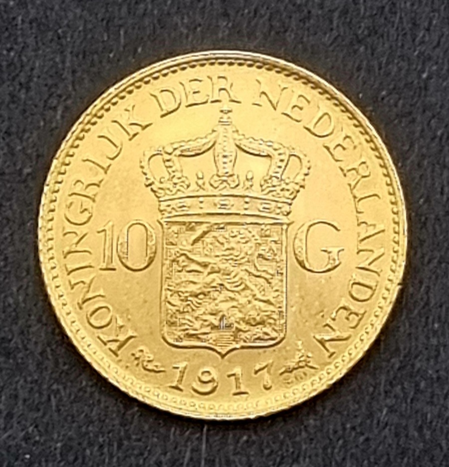 Gouden tientje Wilhelmina met hermelijnen mantel uit 1917, bevat 900/1000 goud en gemerkt met muntmeesterteken zeepaard. Rondom de munt is de tekst "KONINGIN WILHELMINA, GOD ZIJ MET ONS" geschreven en op de weerszijde is het gekroond Nederlands wapenschild afgebeeld. Het gouden tientje is ontworpen door J. C. Wienecke.
