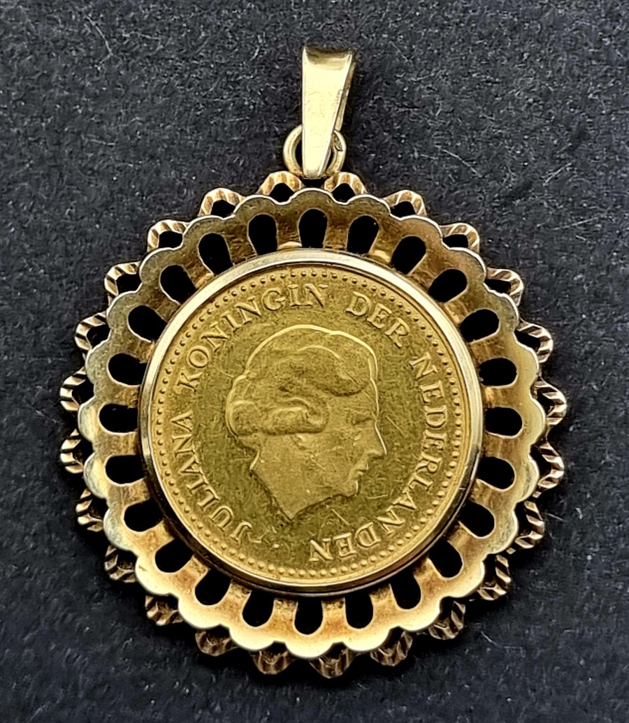 Gouden 14-karaats hanger met een gouden 50 gulden munt van de Nederlandse Antillen uit 1979. De munt is van 900/1000 goud met de beeltenis van Koningin Juliana, de omlijsting is vervaardigd met een opengewerkte schulprand. Datering laatste kwart 20 eeuw.