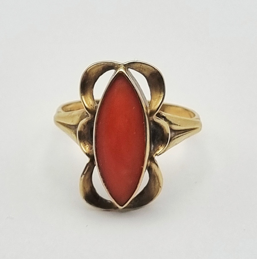 Gouden 14-karaats ring bezet met een markiesvormig geslepen bloedkoraal in een gladde zetting. Het geelgouden montuur toont een opengewerkte zetting met decoratieve krulmotieven. De ring is aan de binnenzijde gemerkt met het Nederlandse eikenblad, datering midden 20e eeuw.