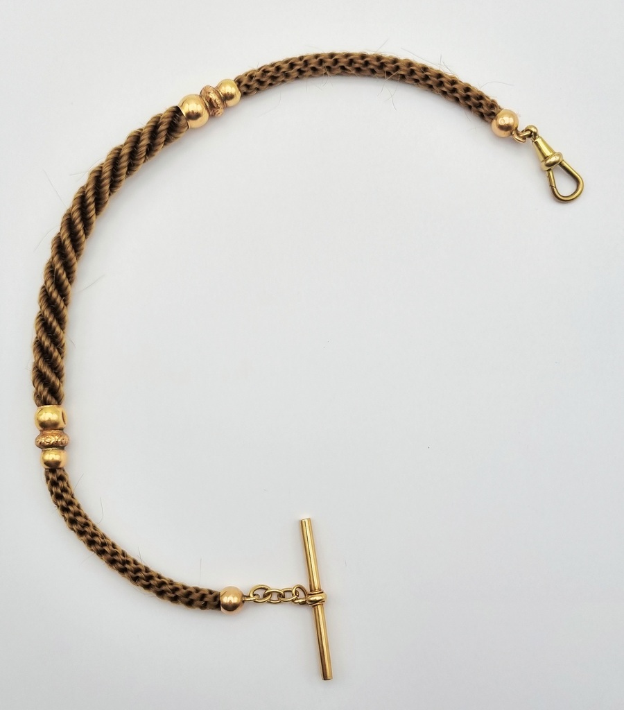 Horlogeketting vervaardigd uit gevlochten paardenhaar met gouden montering getoetst als 14-karaats, uit de Victoriaanse periode. Het vlechtwerk varieert in textuur en wordt onderbroken door gegraveerde monturen. De horlogeketting is uitgevoerd met een functionele T-bar aan een korte jasseron schakel en een karabijnsluiting. Datering eind 19e eeuw.