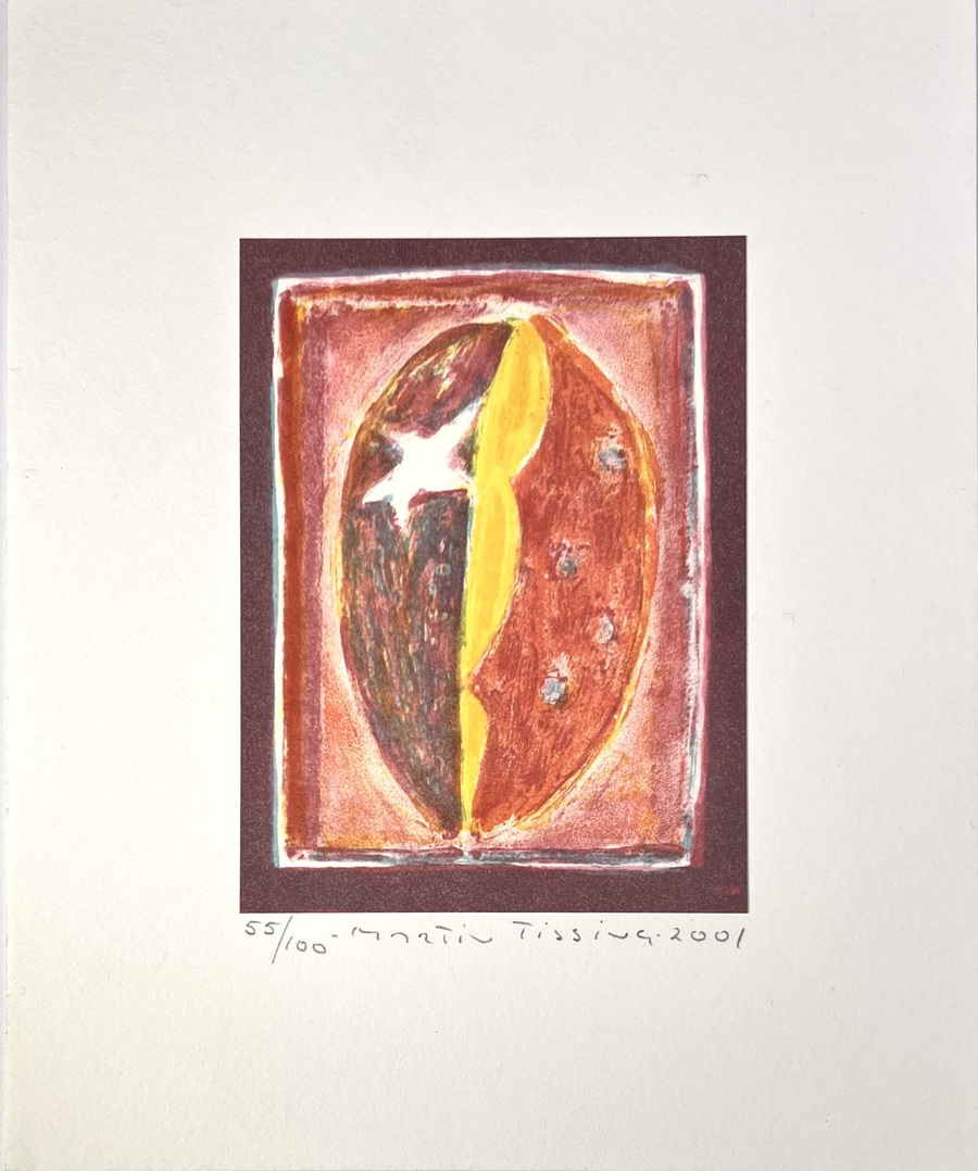 Zeefdruk door Martin Tissing (1936–2018) op papier toont een abstracte compositie met een centraal stermotief in modernistische stijl. De gelaagde kleurvlakken in warm terracotta, oker en heldergeel vormen een dynamisch contrast met de donkere omlijsting. Linksonder oplagenummer 55/100 en gesigneerd met datering 2001 in potlood in de marge. De zeefdruk heeft een Groningse herkomst.
