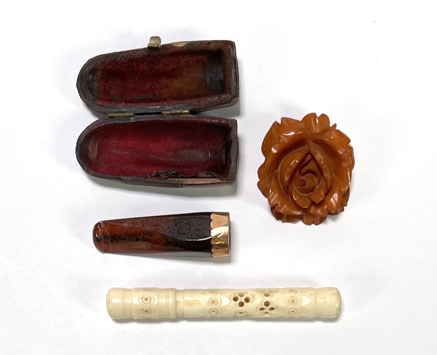 Lot curiosa; een barnsteen rookmondstuk in foedraal, een gegraveerde benen naaldenkoker en een gesneden roos van kunststof. Het mondstuk heeft een gouden applicatie gedecoreerd in Art Nouveau stijl, de naaldenkoker is opengewerkt met gestileerde motieven uit been.
