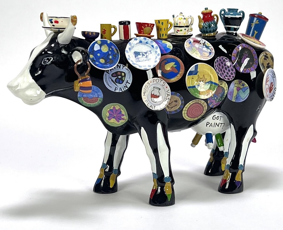 Beeld van Meredith McCord voor CowParade in postmoderne stijl, vervaardigd uit keramiek met meerkleurige handbeschildering. Dit object, getiteld "Moo Potter", toont een zwarte koe gedecoreerd met talloze miniatuurvormen van borden, theepotten en vazen. Het beeld werd ontworpen voor het Houston evenement en toont tekstuele elementen op het corpus. Het beeldje dateert uit 2001 en heeft een Amerikaanse herkomst.