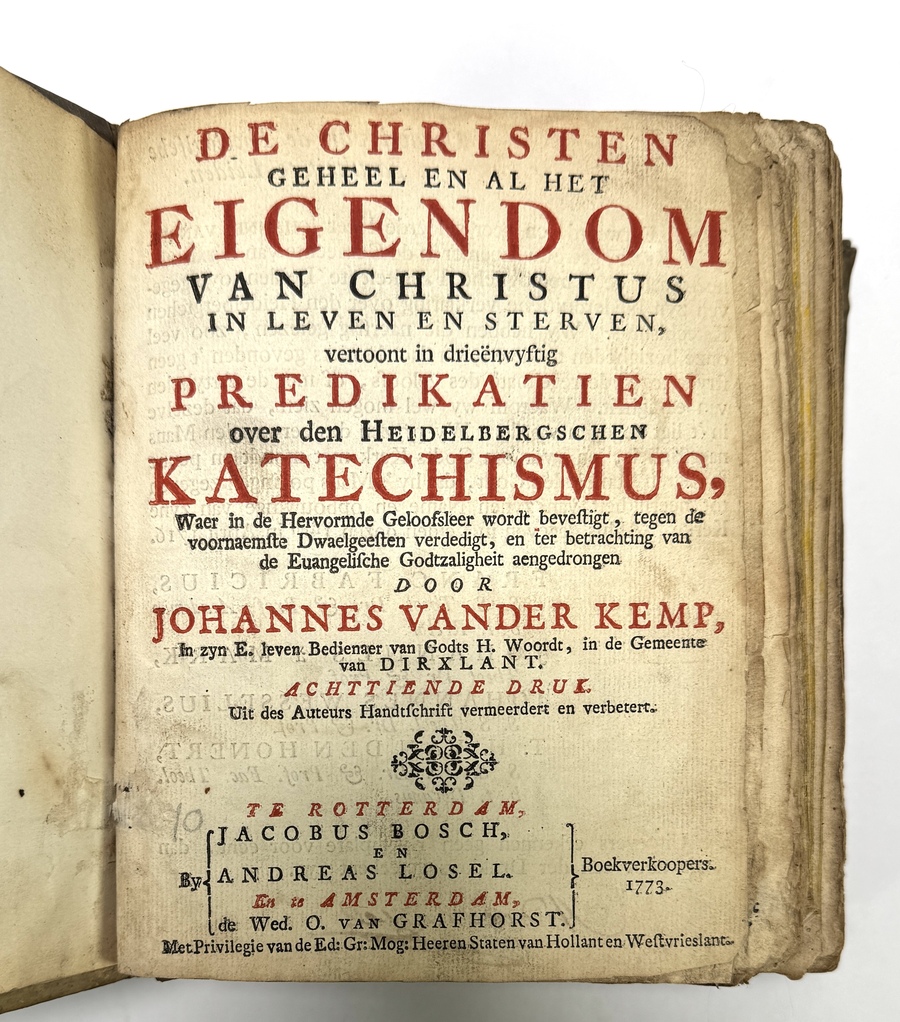 Boek van Johannes van der Kemp (1664–1718) uit de 18e eeuw, vervaardigd uit papier met een perkamenten band. Het theologisch werk 'De Christen geheel en al het eigendom van Christus' bevat drieënvijftig predicaties over de Heidelbergse Catechismus. Deze achttiende druk uit 1773 toont een karakteristieke tweekleurendruk.