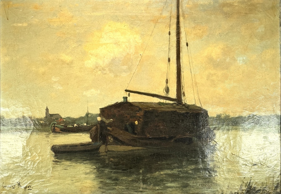 Schilderij door Cornelis Kuypers (1864–1927), een riviergezicht met een afgemeerde schuit en kerktoren in realistische stijl, uitgevoerd in olieverf op doek. De compositie toont een atmosferische weergave van de bewolkte lucht en de weerspiegeling in het water. Gesigneerd linksonder, het werk dateert uit de vroege 20e eeuw en heeft een Nederlandse herkomst. Goudkleurige ornamentlijst.