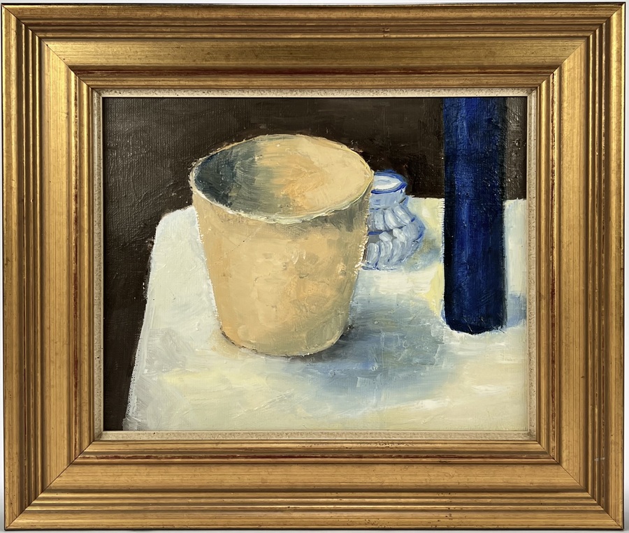 Het schilderij toont een sober stilleven met een cilindrische beker en een verticale fles op een licht tafelvlak, uitgevoerd in olieverf op doek in modernistische stijl. De centraal opgebouwde compositie benadrukt volume en lichtwerking door brede, zichtbare penseelstreken en een beperkt kleurpalet van crème, grijs en diepblauw. Het schilderij is onduidelijk gesigneerd, gedateerd 2018 op de achterzijde en heeft een Nederlandse herkomst.