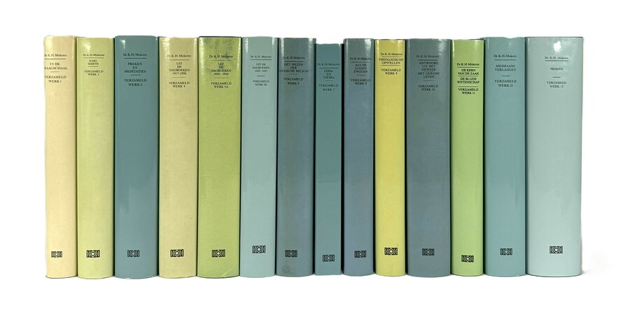 Boeken van Dr. K.H. Miskotte (1894–1976) uit de modern-theologische periode, bestaande uit de dertiendelige reeks Verzameld Werk. De uitgave is uitgevoerd in linnen banden met meerkleurige stofomslagen in pastel- en aardetinten. Uitgegeven door Uitgeversmaatschappij J.H. Kok te Kampen met offsetdruktechniek. De reeks bevat titels zoals Als de goden zwijgen en dagboeken. Het serie dateert uit 1982–1990 en heeft een Nederlandse herkomst.