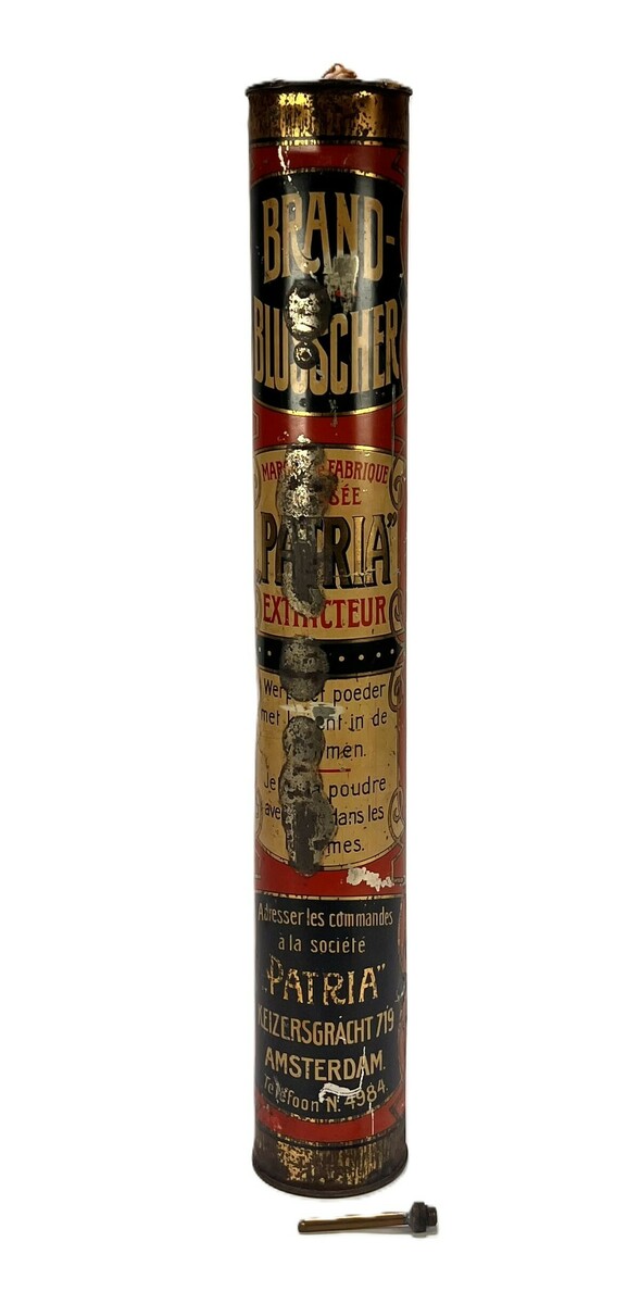 Poederblusser van Société Patria uit de vroege twintigste eeuw, vervaardigd uit metaal met messing beslag. De cilindrische rode corpus toont een gelithografeerd label met instructies in het Nederlands en Frans. Kenmerkend is het adres op de Keizersgracht in Amsterdam. De poederblusser fungeerde als brandblusapparaat en toont een functionele vormgeving met decoratieve banden en dateert uit circa 1930.
