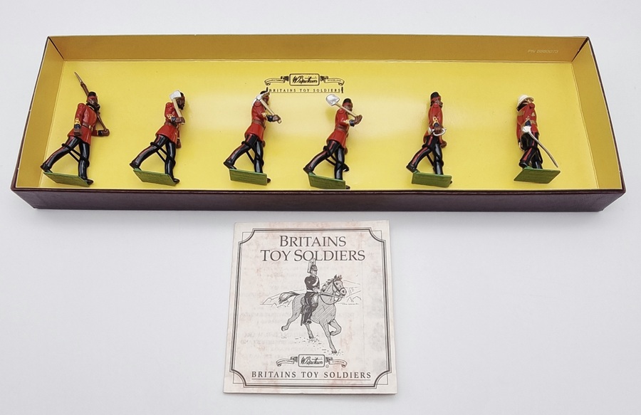 Gietmetalen handbeschilderde soldaatjes in koloniale uniform van W. Britain. De zes marcherende figuren van "The Queen's Own Madras Sappers & Miners" zijn uitgerust met geweer, schop, houweel en sabel. De uniformen zijn rood met zwarte broek en groene voetstukken. Vermelding op de doos nummer 8847 en Britains Petite Ltd, daterend 1997 en een Engelse herkomst.
